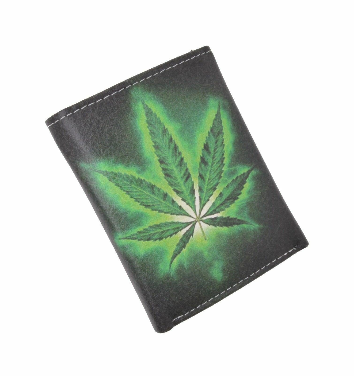 Marijuana Leaf Mens Genuine Leather Trifold Wallet Black Interior With Gift Box