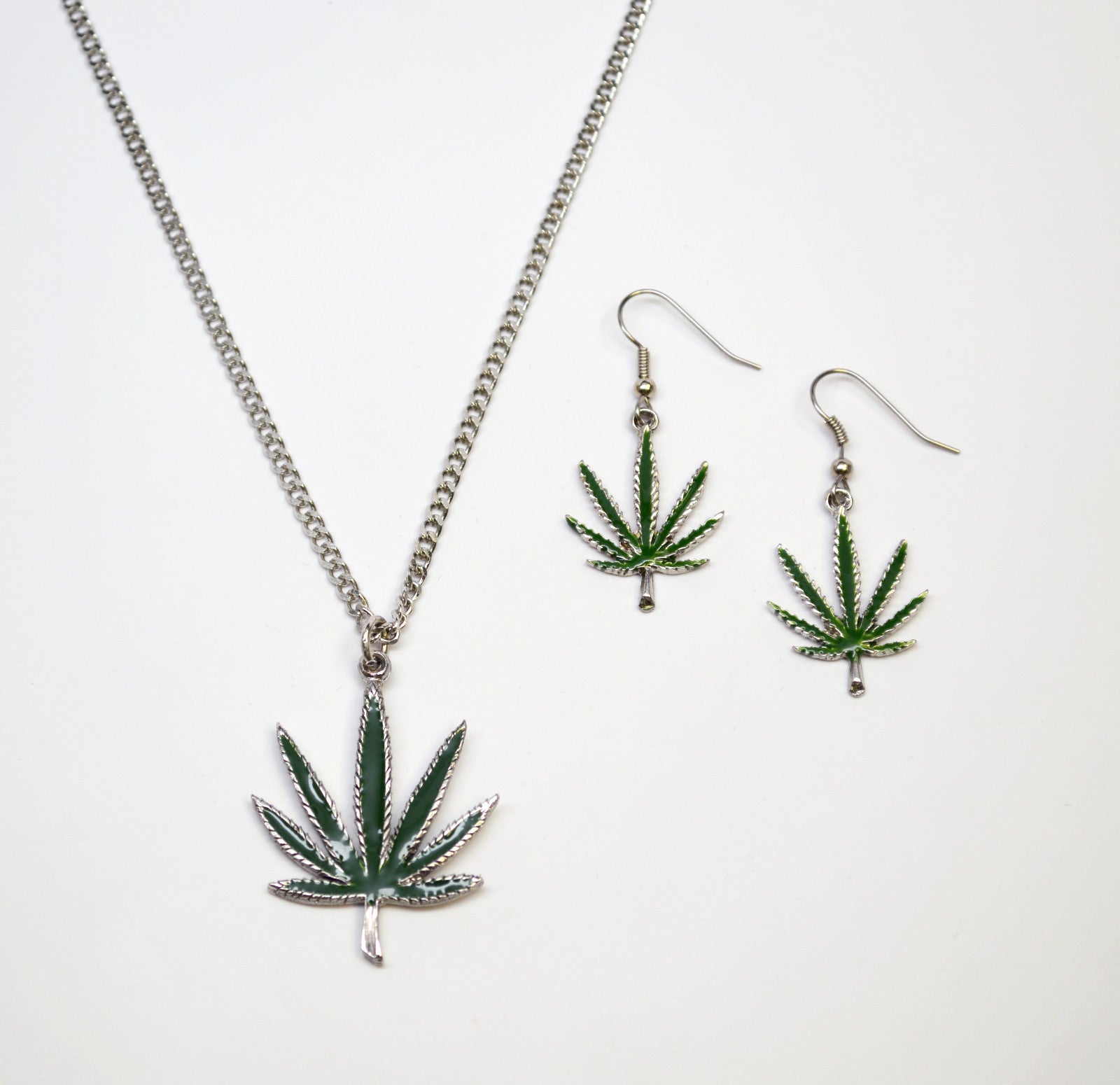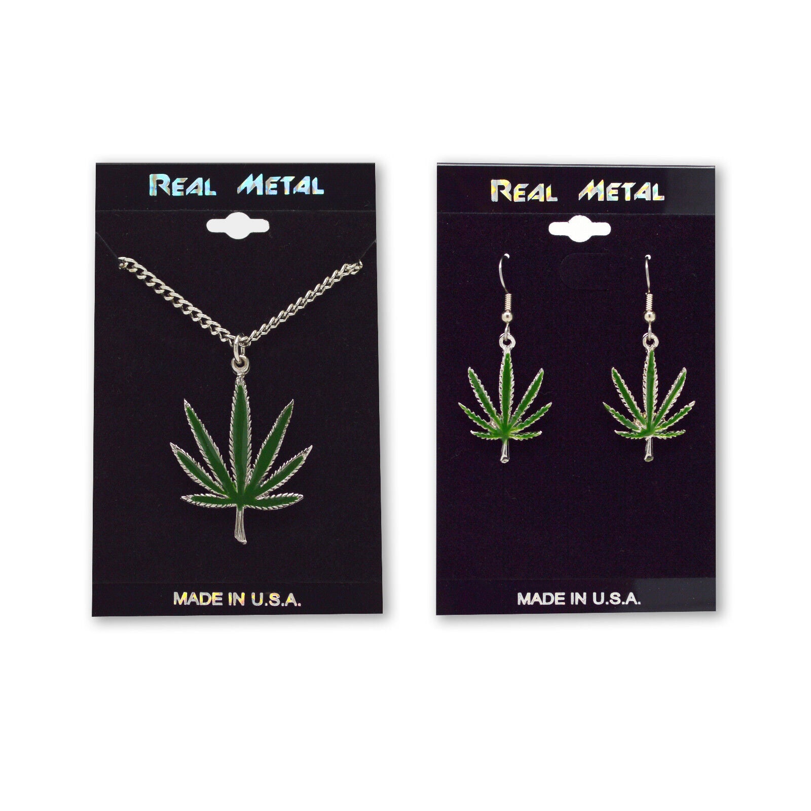 Pot Leaf Earrings and Necklace Set Green Enamel Made out of high quality pewter. Great Gift