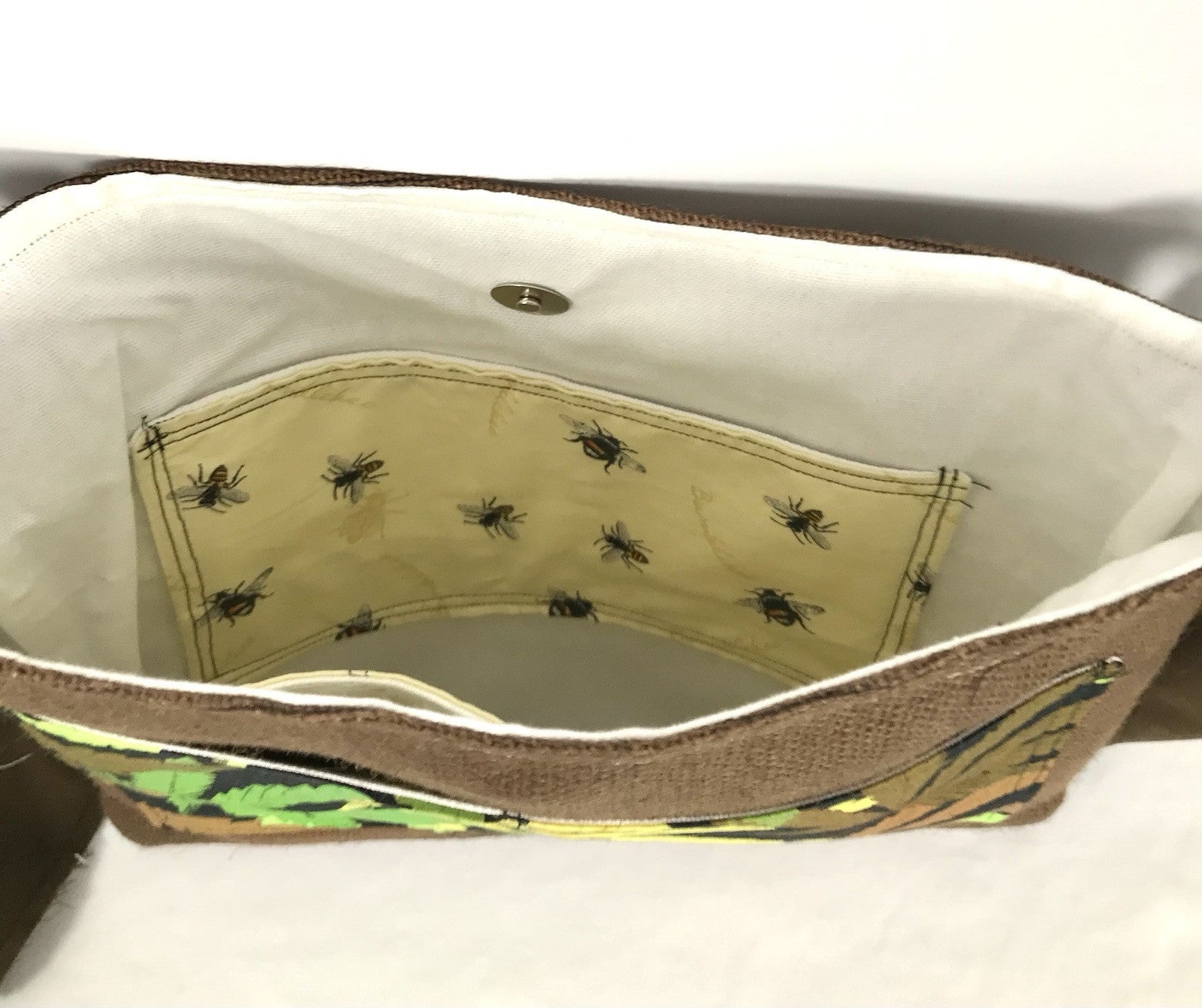 This is a large handmade crossbody bag with a marijuana cannabis pot leaf pattern on brown burlap fabric. It features two interior bumblebee pockets, a magnetic closure, and a crossbody strap with brown handle/strap. The bag is rectangular in shape and has a cotton lining in cream color. The style is inspired by Rasta, hippie, and boho themes, with a focus on peace and one love. Thx for looking!!