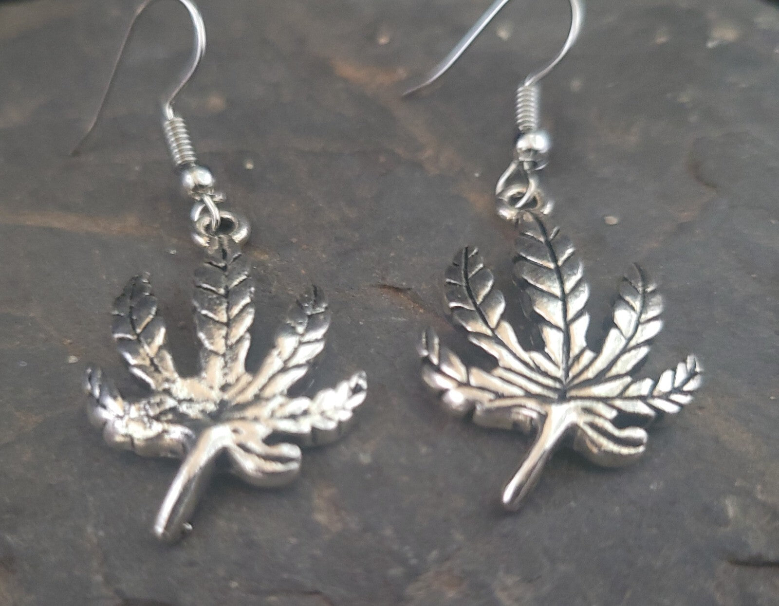 THESE NEW EARRINGS FEATURE A SILVER POT LEAF. THEY HAVE HYPO ALLERGENIC HOOKS.